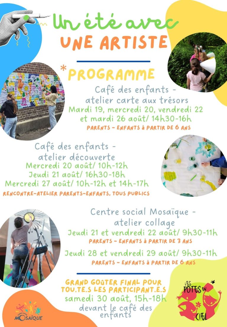 Ces approches irriguent le projet des Potes en ciel et les activités artistiques et culturelles sont nombreuses au sein du café des enfants et des actions hors-les-murs. Afin favoriser une rencontre encore plus épanouie et profonde avec les arts, nous avons souhaité mobiliser la présence d’artistes sur le temps long.